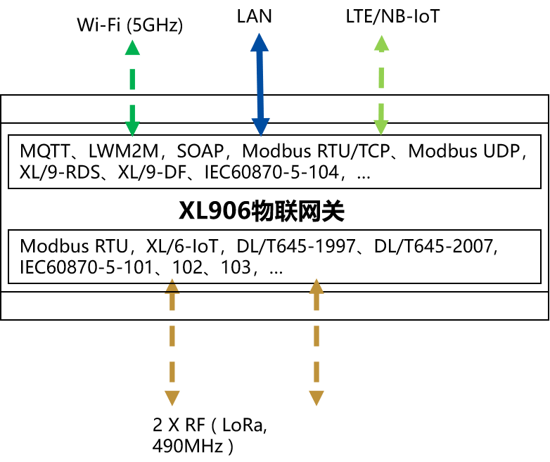物聯網關,通過以太網,或NB/GPRS/LTE聯接云端,支持MQTT,LWM2M,XL/6-IoT協議,或用戶指定協議